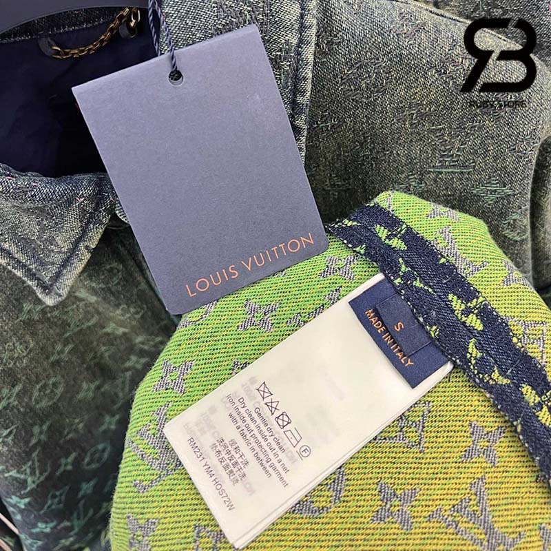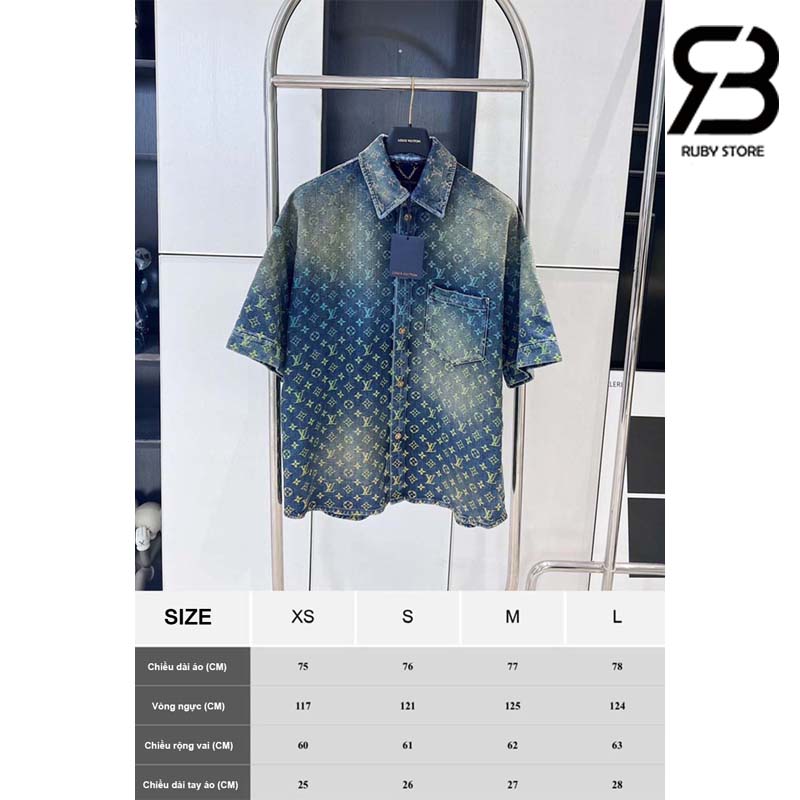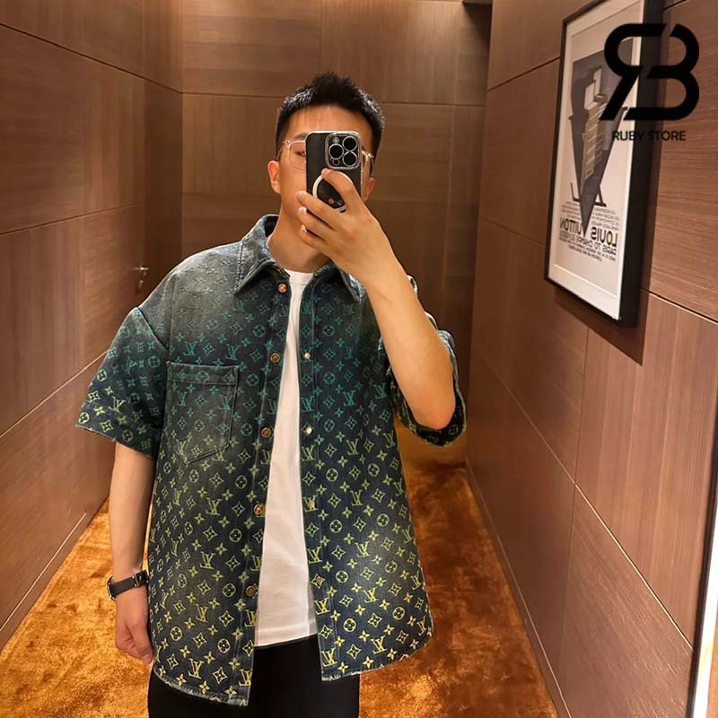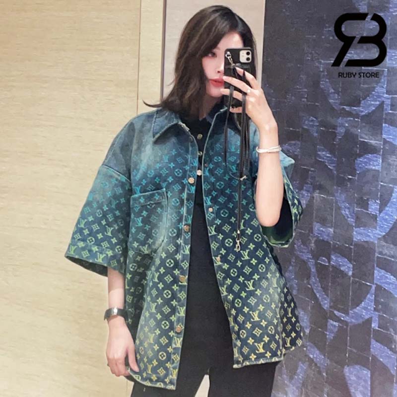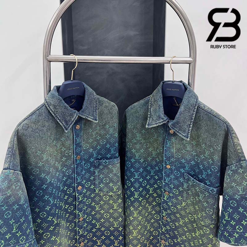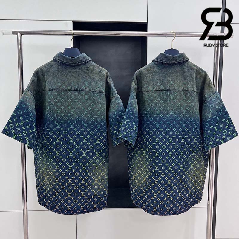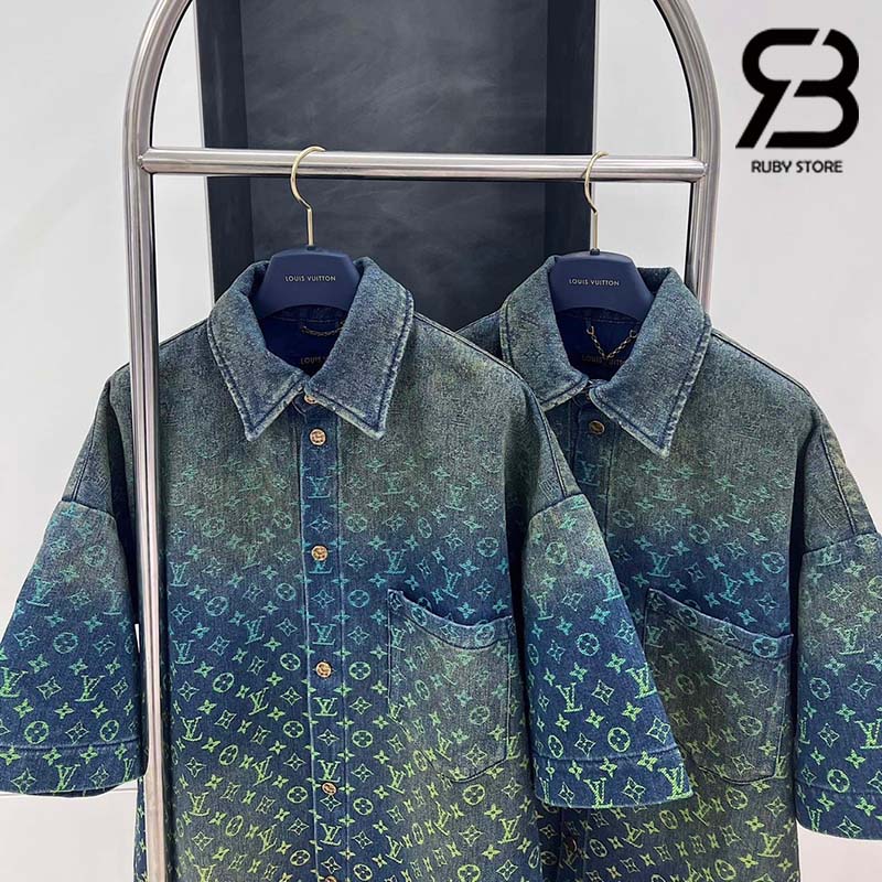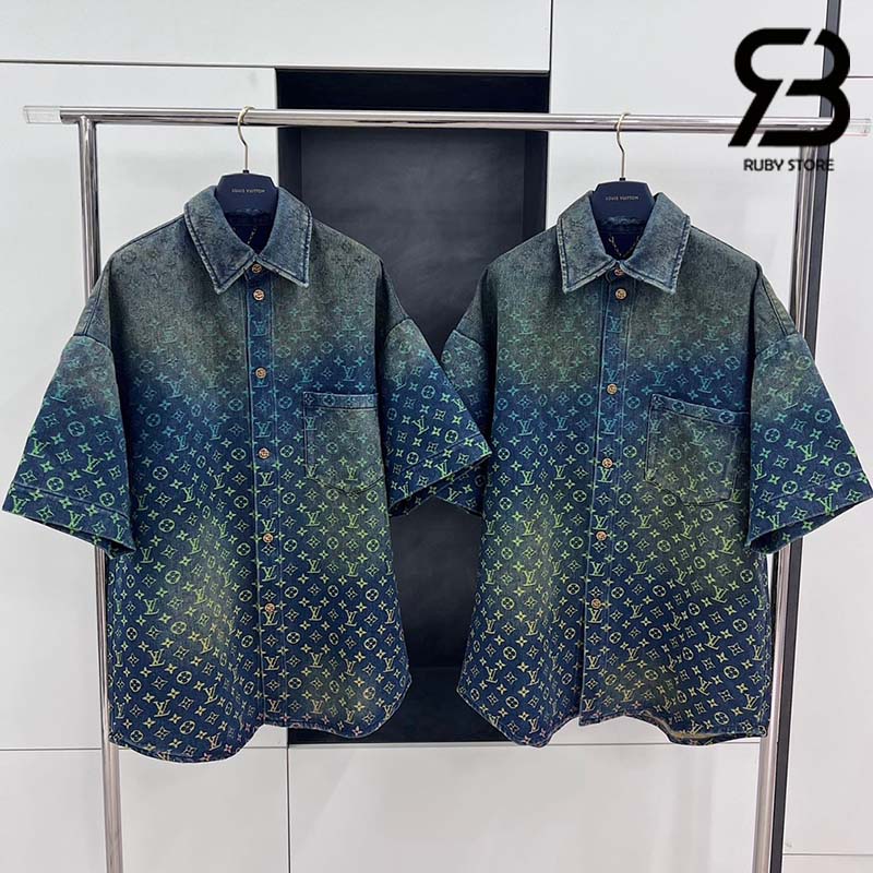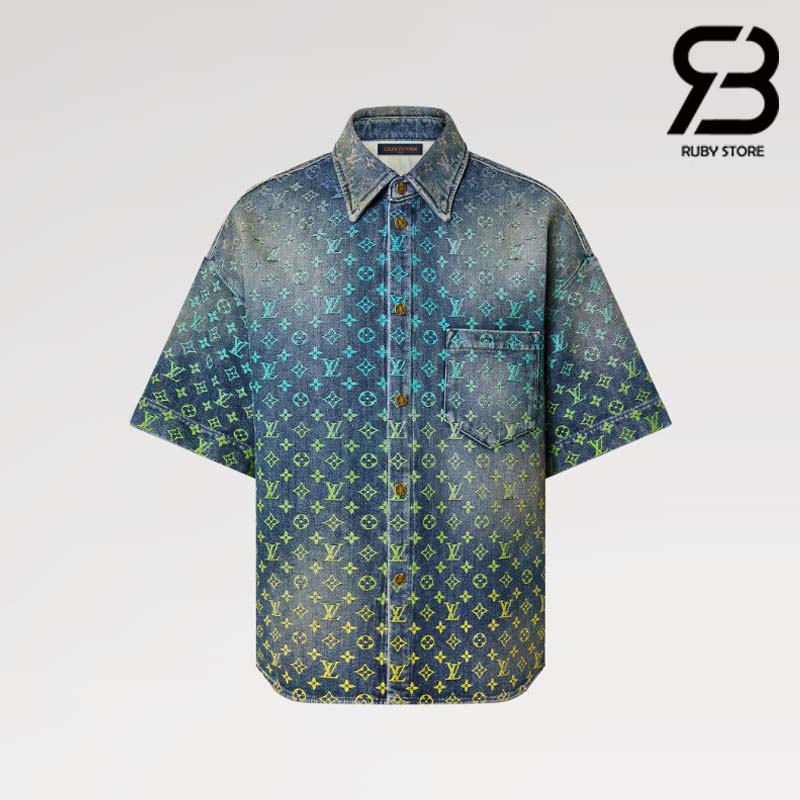 Chiếc áo sơ mi denim tay ngắn này có hoa văn Rainbow Monogram trải khắp với các gam màu pastel xanh, xanh lá và vàng hòa quyện vào nhau. Chiếc áo thời trang này mang phong cách bình dị có hiệu ứng và có thể kết hợp với quần short tương tự để có vẻ ngoài hoàn chỉnh.