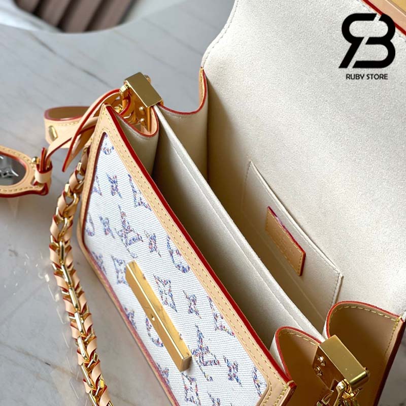 Thuộc phần của bộ sưu tập Nautical, Mini Dauphine này được trang trí với các chữ LV đa màu và hoa Monogram. Họa tiết jacquard được tạo ra thông qua việc dệt bằng cách sử dụng 66 sợi chỉ có màu khác nhau để tạo ra một dải màu tinh tế. Vải sau đó được phủ một lớp bảo vệ. Chiếc túi có dây xích bện và dây đeo da – cả hai đều có thể tháo rời.