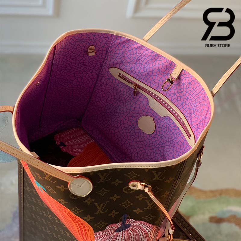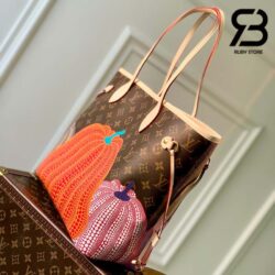 Thuộc bộ sưu tập hợp tác đặc biệt Louis Vuitton x Yayoi Kusama, túi Neverfull MM LV x YK lấy cảm hứng từ chủ đề nổi tiếng trong các tác phẩm của Yayoi Kusama: quả bí ngô. Hình ảnh này mang đến cho Kusama cảm giác ấm áp và bình yên từ khi bà còn nhỏ. Những quả bí ngô được tạo thành từ dấu chấm tròn lặp đi lặp lại trong gam màu rực rỡ tô điểm cho chất liệu Monogram Canvas biểu tượng của Louis Vuitton.